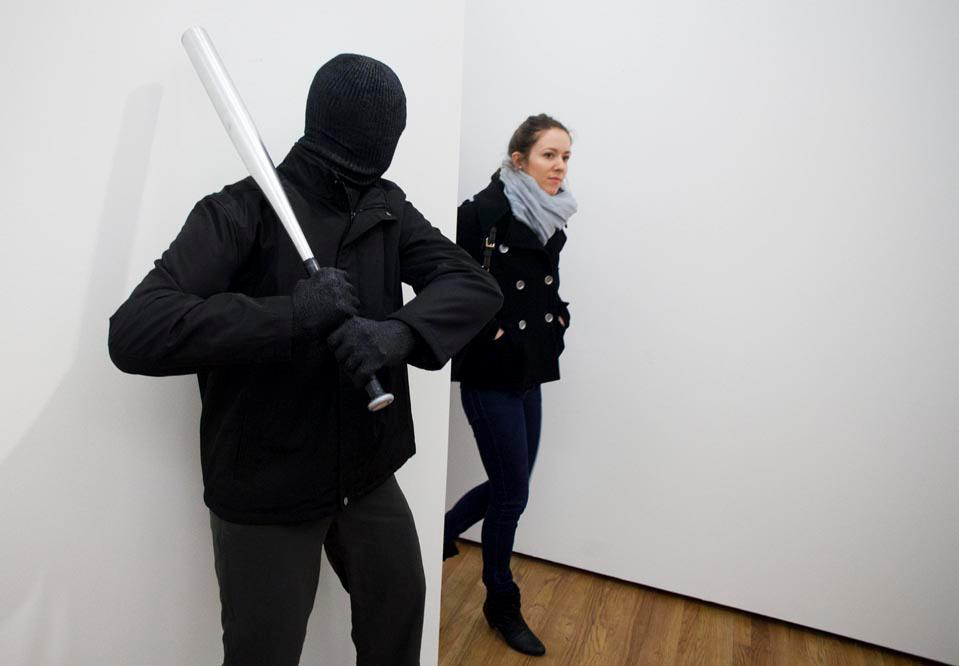 Some of his work has a very macabre tone to it, scary looking men in hoodies, and in one case, actually threatening visitors to the place where it is set up…