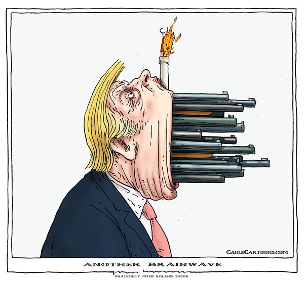 Obviously, like the rest of the world he is following the extremely strange and alarming theatre that is occurring in the USA just now – the run up to their Presidential Elections. And he has dealt with that extraordinary creature Donald Trump (Drumph) as well. So here are a couple of cartoons that show his feelings about that dreadful school yard bully.