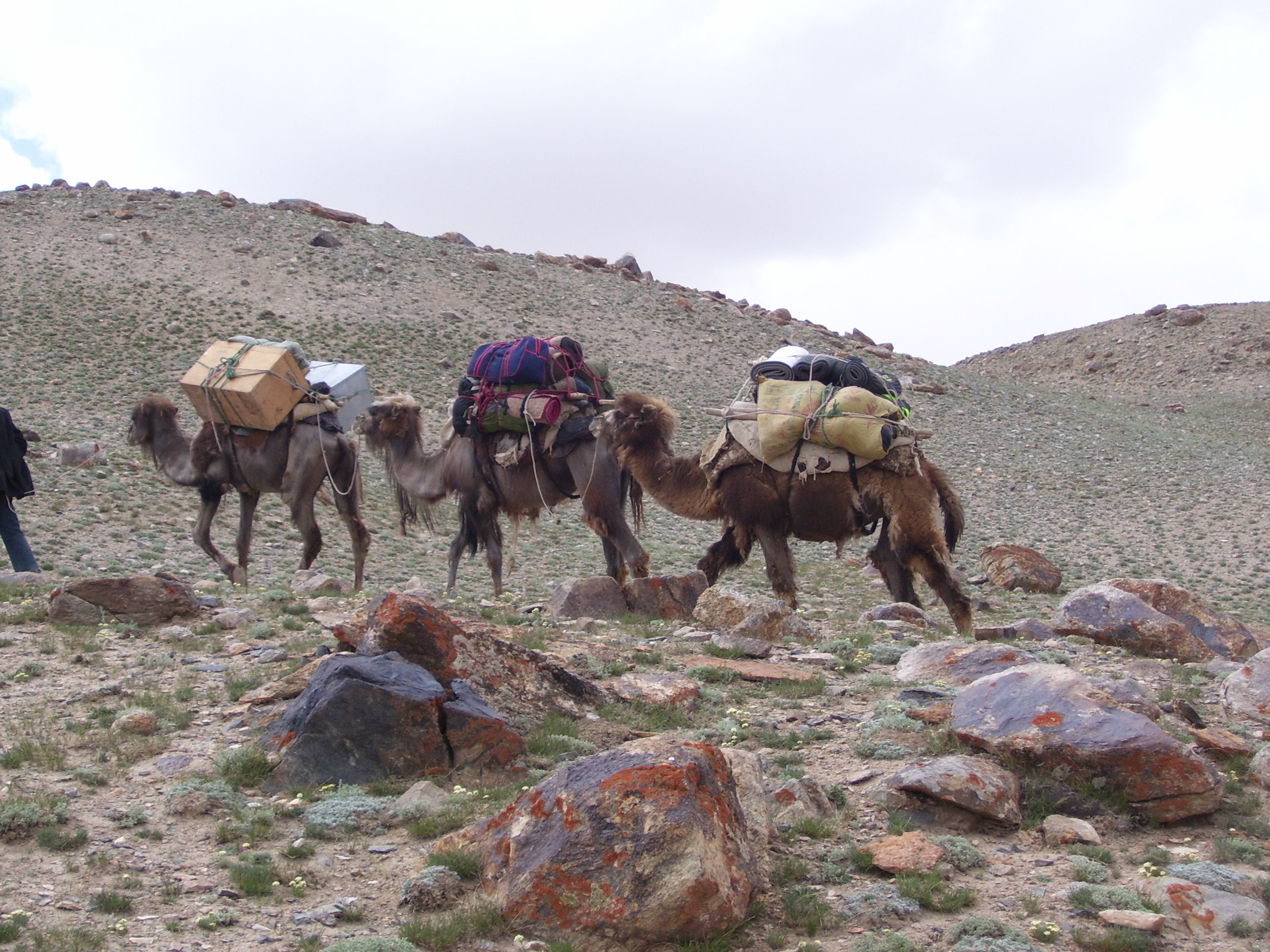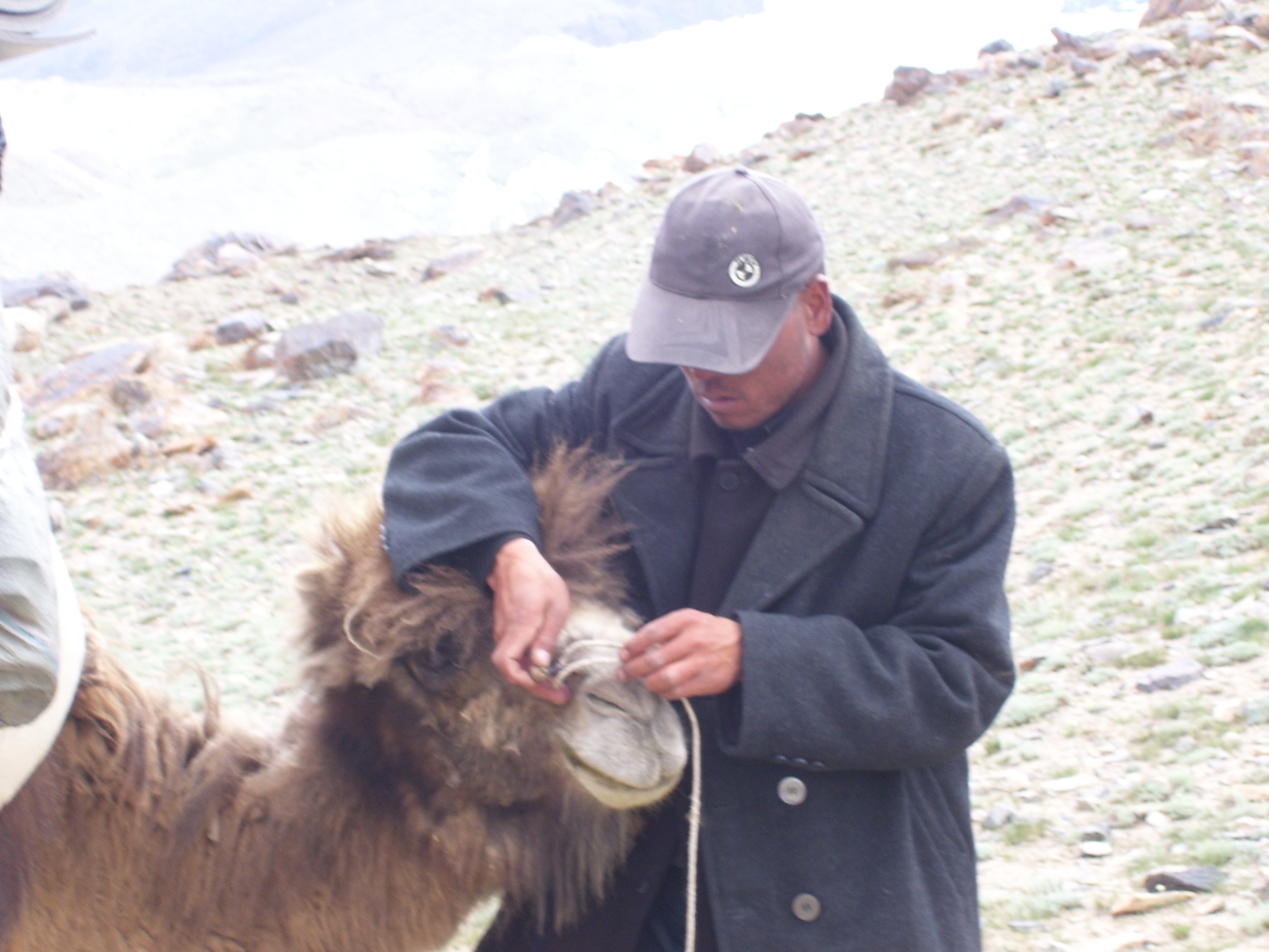 The next morning we were introduced to our camels – not for riding, but to carry our tents, food and other stuff.. They were under the control of a cheerful bunch of Tadjik camel herders, who spoke hardly any English nor Mandarin, but only Tadjik. But we seasoned travelers managed to communicate easily enough in spite of this… None of us spoke a word of Tadjik of course – do you?