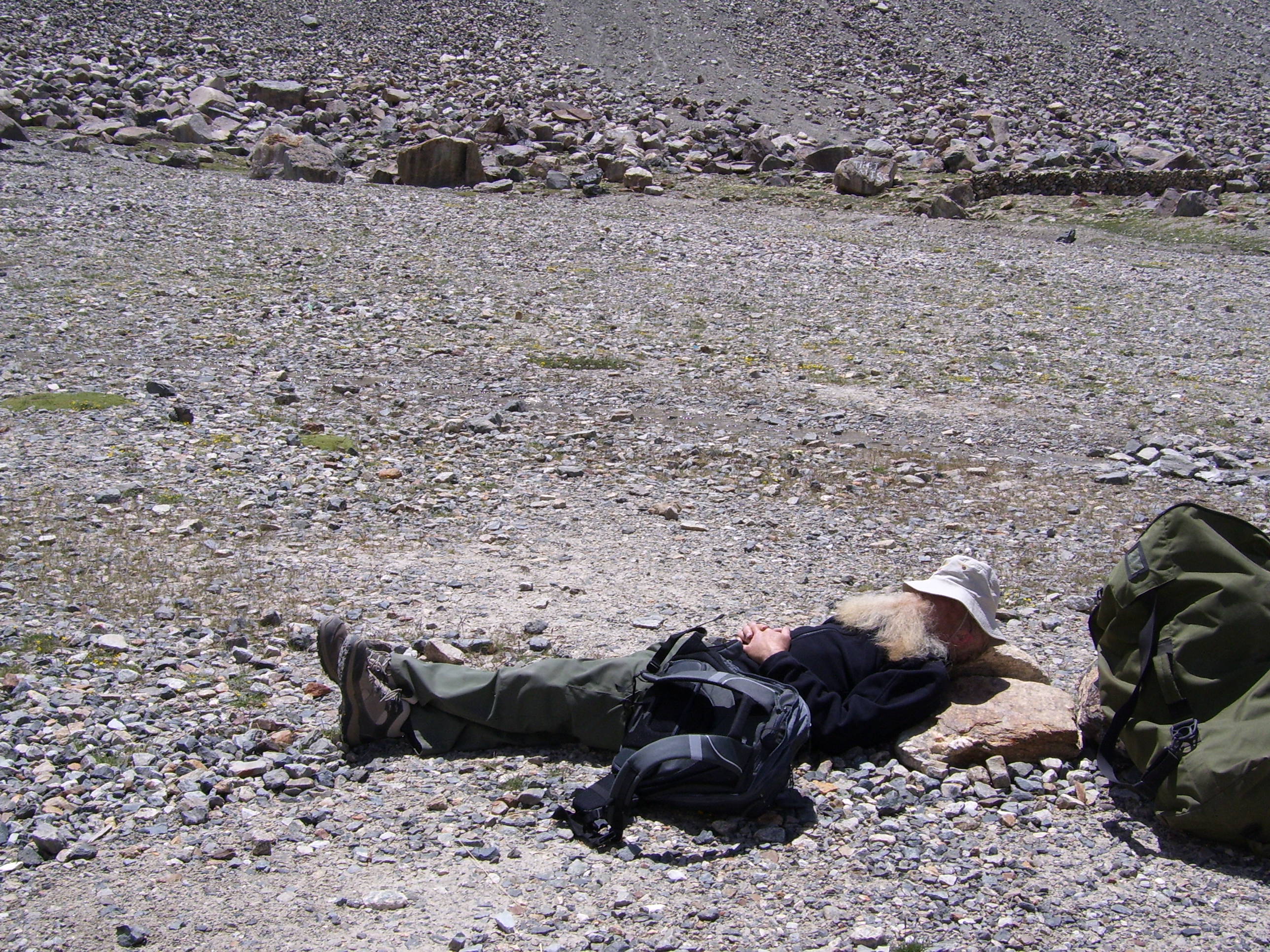 So for the next couple of days we plodded cheerfully enough across this vast and unchanging landscape, slowly getting higher and higher as we went. By the third day we had reached about 4000 meters, and I began to feel the first effects of altitude sickness, but not enough to stop me, just a bit of a head ache and breathlessness, so I had to stop every 80 or so meters, lie down for a few minutes until I had recovered, and then plod on again.