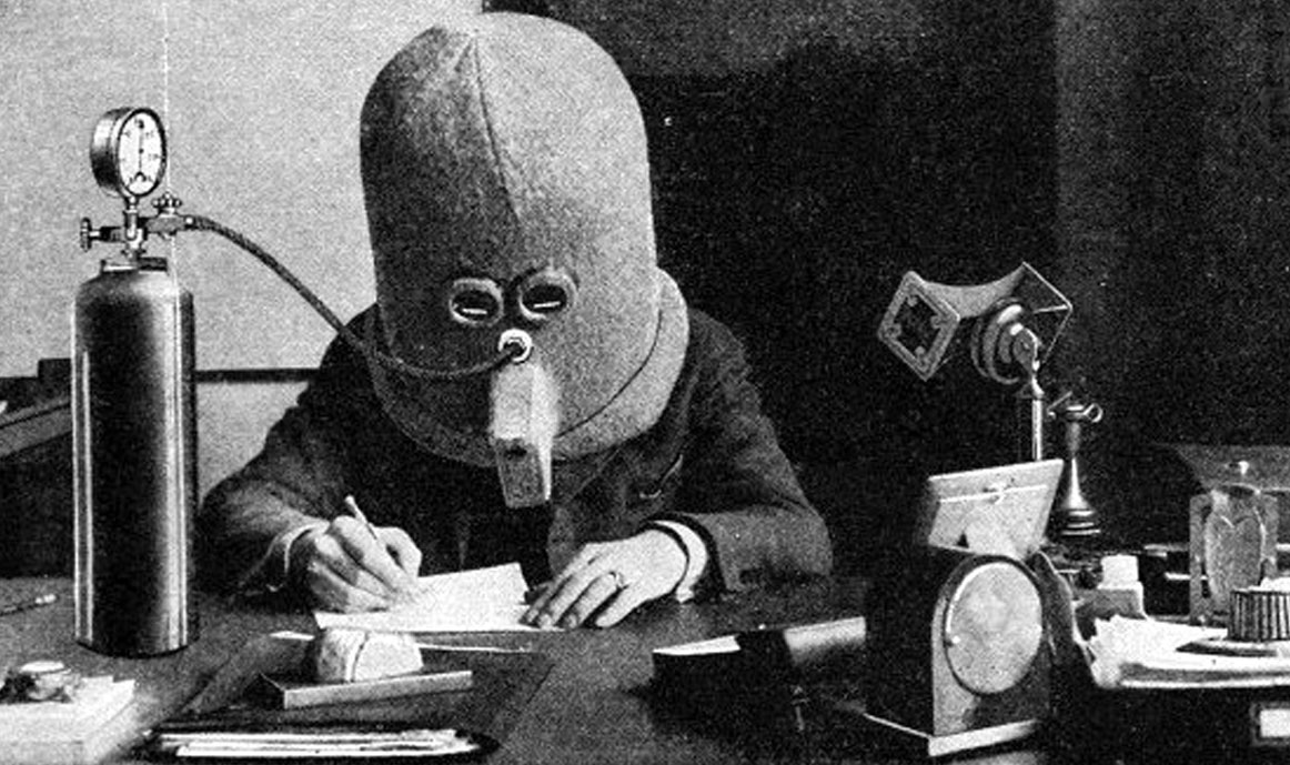 Here is a truly curious bit of arcana, the Isolator Helmet, the dream child of a rather odd man by the name of Hugo Gernsback who “invented” this weird device in 1925 as an aid to concentration. He reasoned as follows : When working, the main problem is distraction, so if you can isolate the individual 100% from all possible surrounding influences, then he or she will be able to give their full attention to the task on hand.
