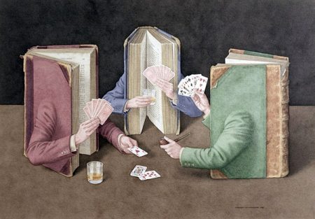 But his chief pleasure seems to be those human-like books, which he paints in a huge variety of situations – fighting, happy, playing chess and so on, just about any activity that humans get up to, but using books with arms instead of people. Odd really, but so beautifully painted.