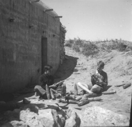 Anyhow this is a very typical example of the work of this artist. He grew up in war torn Poland, which obviously had a profound effect on his later life – so as a kid he played with war things, as you can see in this photo of him with a friend playing outside a damaged Block House with live shells…