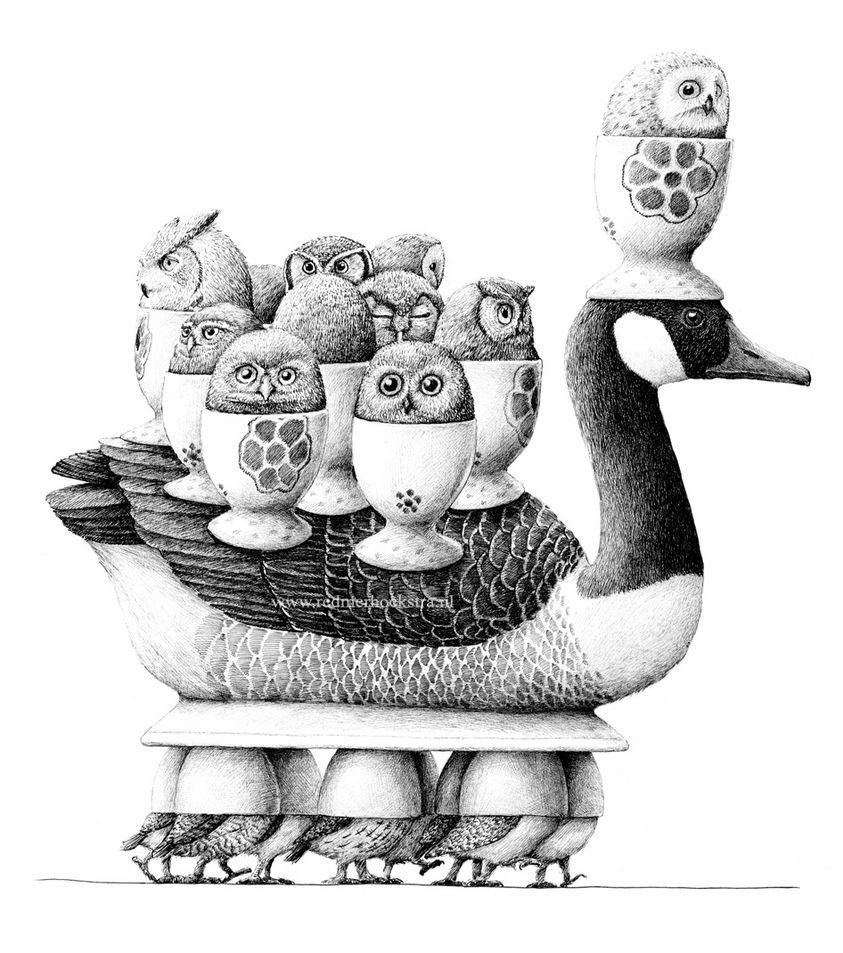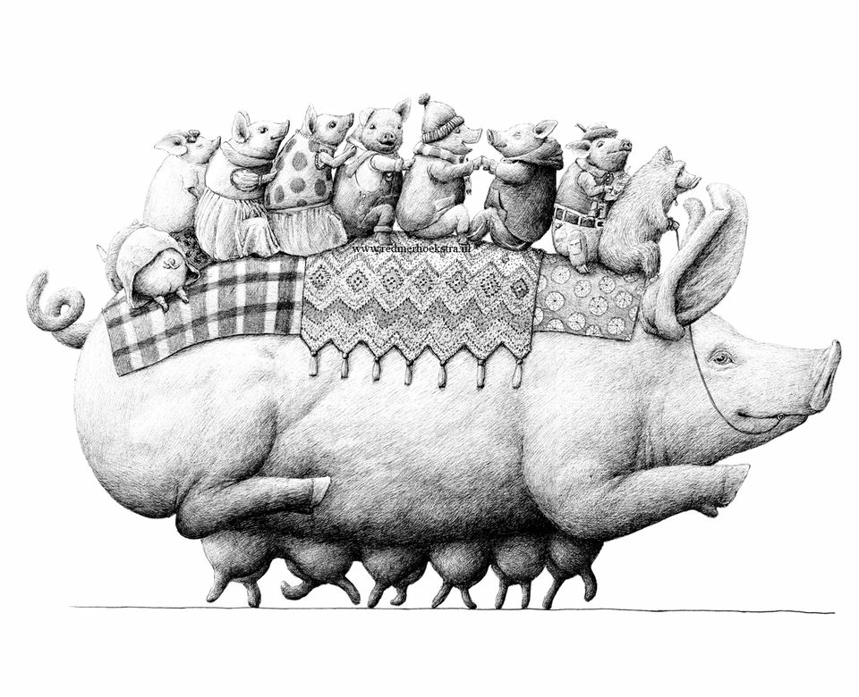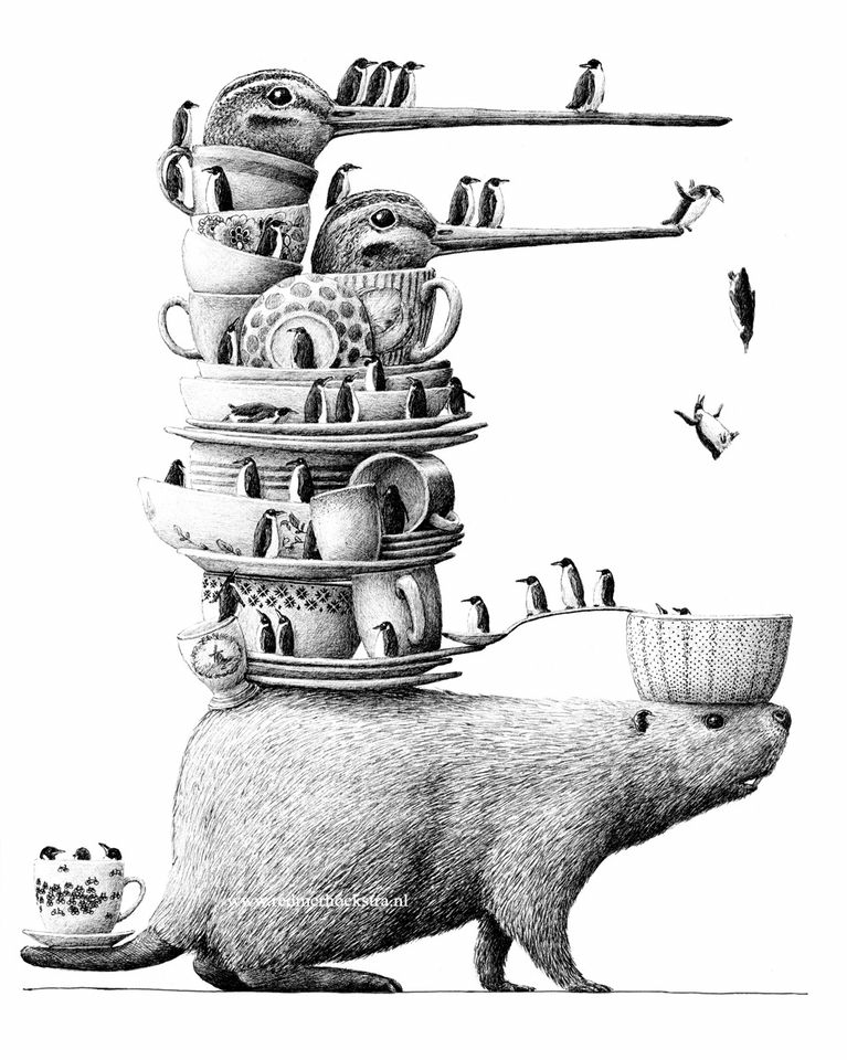 Redmer Hoekstra (1982) graduated from the Art Academy in Zwolle as a visual artist and illustrator in 2009. “I’ve always loved alienation and fantasizing, daydreaming. As a child I had all kinds of theories about how the world worked. At the Academy I was able to rediscover this and process this in to my work. How things work is a fascination of mine and in many drawings you can find this. I open up appliances and objects and freely change what is inside. Often a subject gets a completely different feeling or meaning. I play with form, meaning and function, while new combinations arise. Often surprising, strange and funny but also with a strange kind of logic, a fantastic and surreal world.