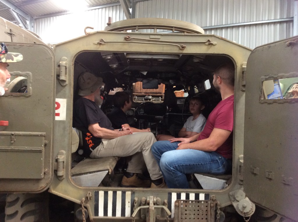 To give you an idea of the scope of this collection!Us sitting happily in a troop carrierUs in a troop carrierMe overwhelmed by all of these tanks!My two grandsons happily sitting in a military jeepJake, My son, admiring an armoured car!Jake, being overwhelmed by a tankAn obvious point!Us admiring a bren gun carrierAnd to finish it off….. a real tank ride!!!!! We are in the turret, my grandkids and me.